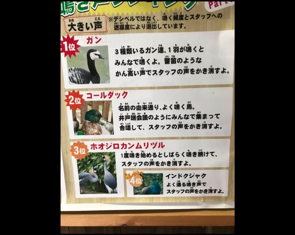 ランクインしているのは、ガン、コールダック、ホオジロカンムリヅル、インドクジャクの4種で、それぞれどんな風に鳴くかが説明されている。その全てが「スタッフの声をかき消すよ」というフレーズで結ばれており、スタッフの皆さんの苦労がにじみ出ている。