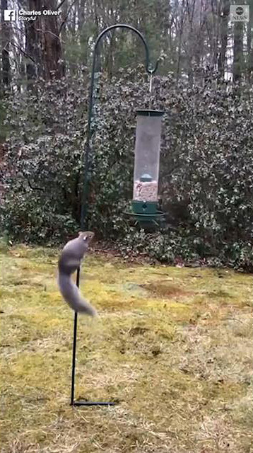 ご主人のチャールズさんによれば、昨年12月にこの餌箱を設置して以来、複数のリスが同様の回転技を披露しているとのこと。餌箱を回転させて地面に穀物を落とそうとしているリスもいれば、単純に乗り心地を楽しんでいるリスもいるとのことです。