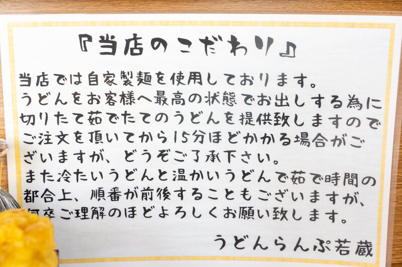 自家製麺を使うこだわりで、切りたて茹でたてのうどんを提供するため、15分程度提供に時間がかかるそうです。