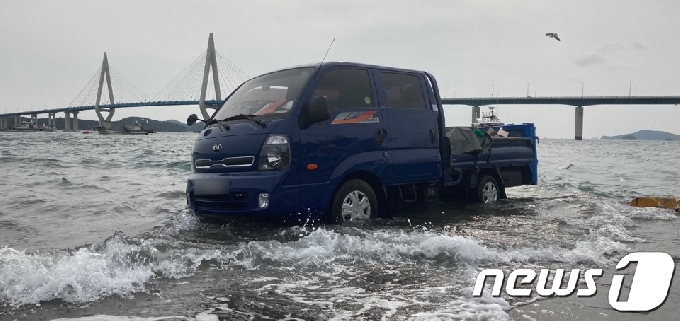 (영월=뉴스1) = 추석연휴인 2일 오후 충남 태안 영목항 물양장에 주차된 트럭 1대가 해양경찰 이동조치로 침수피해를 면했다.(태안해경 제공) 2020.10.2/뉴스1
