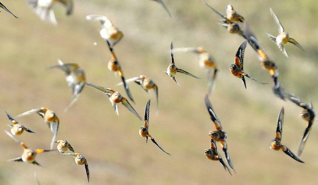 秋の山を飛び交う、何百羽という群れに出会った。大陸から渡ってきた冬鳥のアトリだ。オレンジ色の翼が、やわらかな日差しに映える。季節の移ろいを感じさせる光景だった。 (高島市で、写真・文=横田信哉)