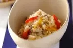 パプリカとピーマン、ベーコン、玉ネギ、マッシュルーム入りの彩り鮮やかなピラフ。バターの良い香りが食欲を喚起します。この一品にスープやサラダを添えれば、立派な一食に。お弁当に入れても良さそうですね。