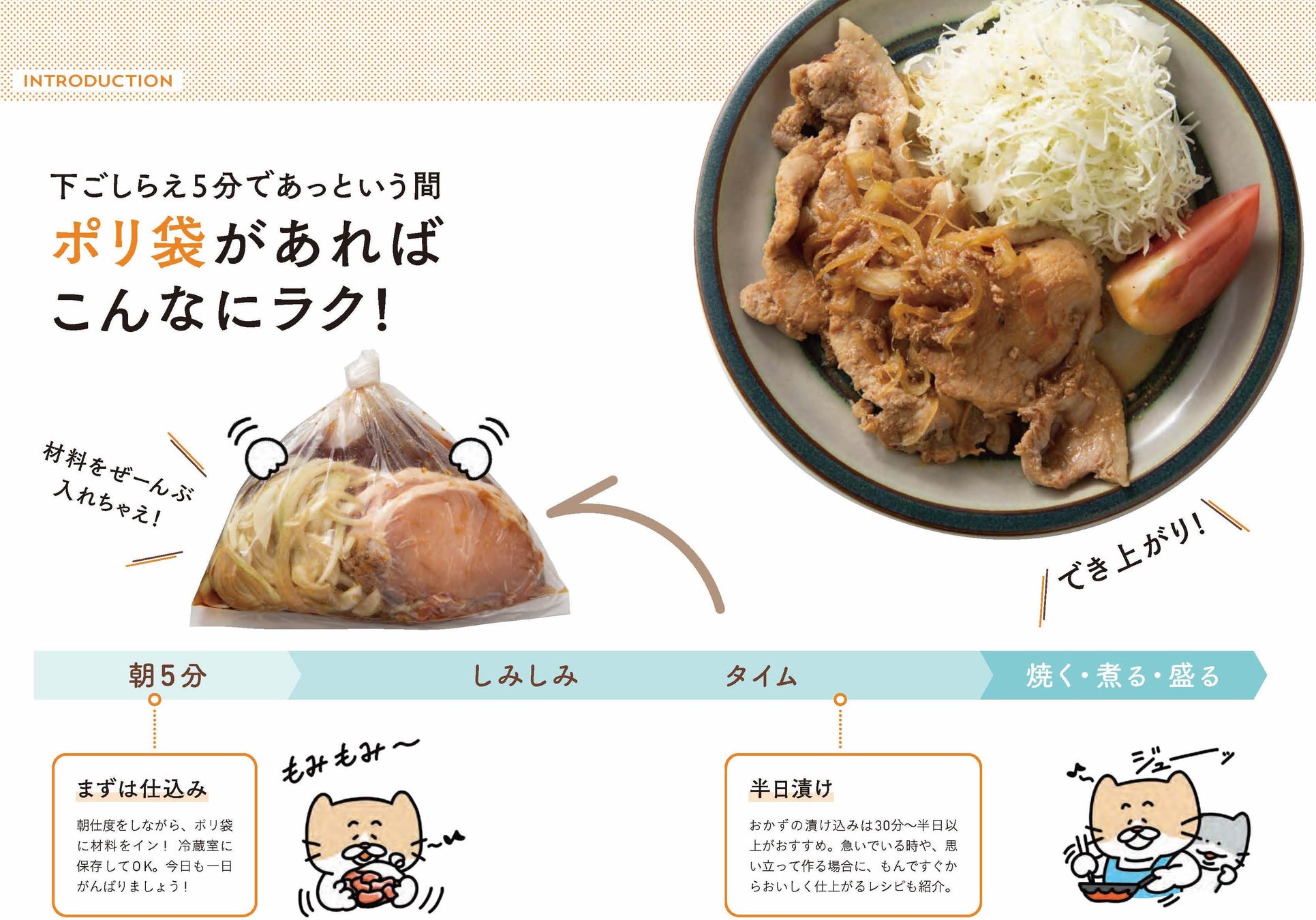 ポリ袋は洗い物が少なく、手も汚れないから忙しい平日のごはん作りに超便利。本書ではおかずから副菜、おやつやパンまで全100品を掲載。和洋中韓と幅広く網羅した1冊です。